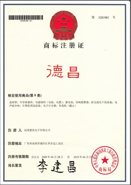 是汕尾德昌電子有限公司在中國的注冊商標(biāo)之一,受法律保護(hù),侵權(quán)必究。 未經(jīng)汕尾德昌電子有限公司書面許可,任何單位和個(gè)人不得以任何方式或理由對該商標(biāo)